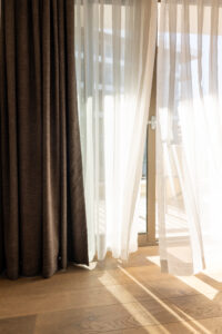 A solução é o sistema duplo: voil ou linho na camada frontal, forro técnico de poliéster de alta tenacidade na camada posterior. O forro protege o tecido principal dos UV, contribui para o isolamento acústico pelo aumento de massa total e garante a vedação de luz necessária conforme o ambiente. Durante o dia, a camada de voil filtra o brilho excessivo sem escurecer o ambiente; à noite, o forro garante privacidade e bloqueia a poluição luminosa externa.